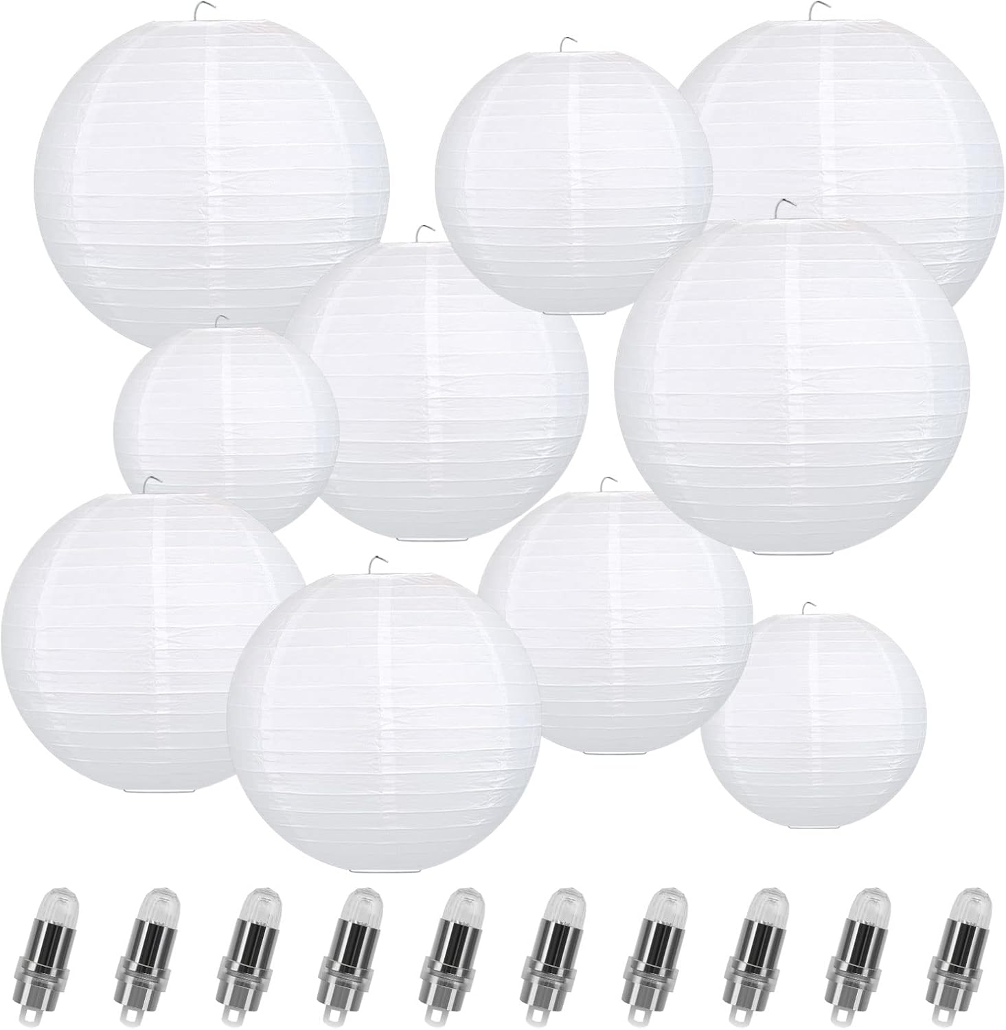 – Set includes 10 white paper lanterns in assorted sizes (6”, 8”, 10”, 12”) for a variety of decorating options.