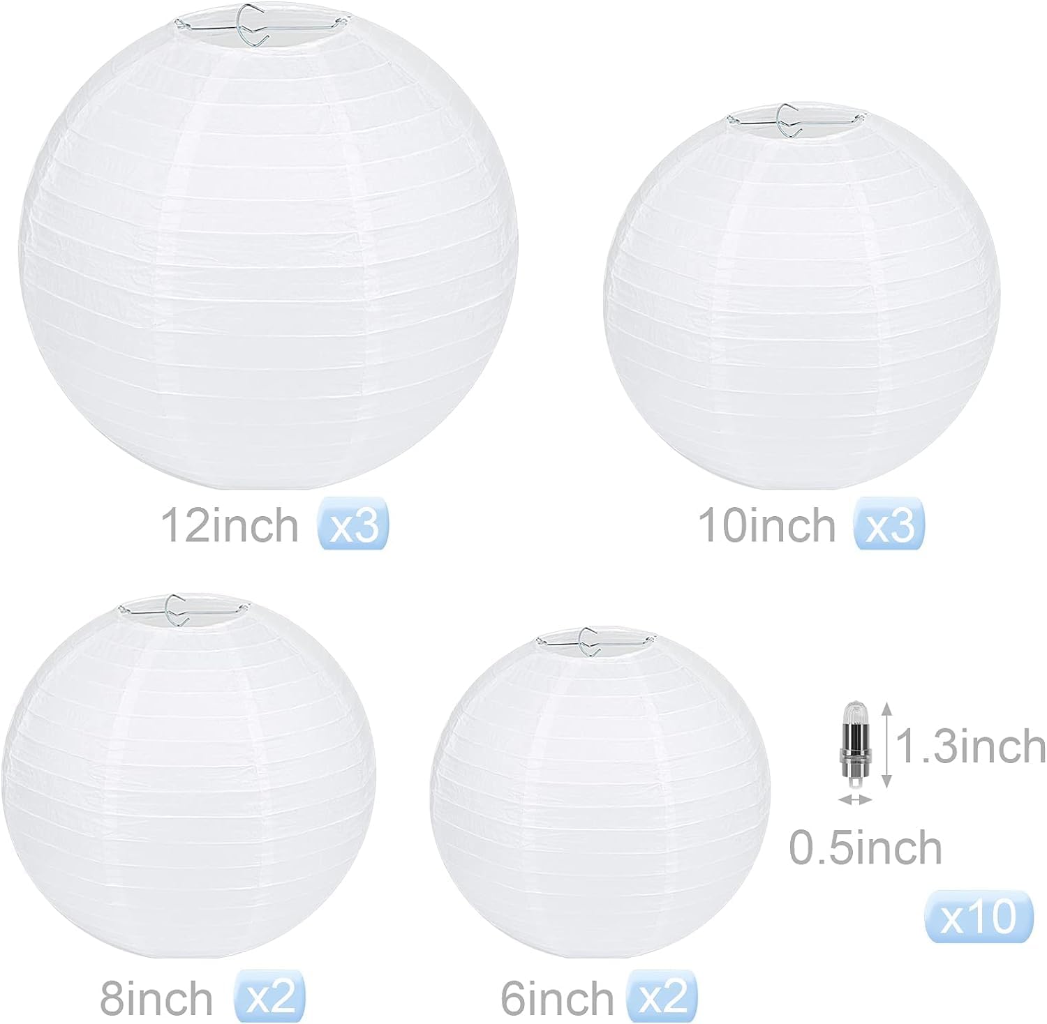 LIHAO 10PCS White Paper Lanterns with Lights, Round Hanging Paper Lanterns Decorative Chinese Lanterns for Wedding Anniversary Birthday Party Home Decor(Size of 6”, 8”, 10”, 12”)