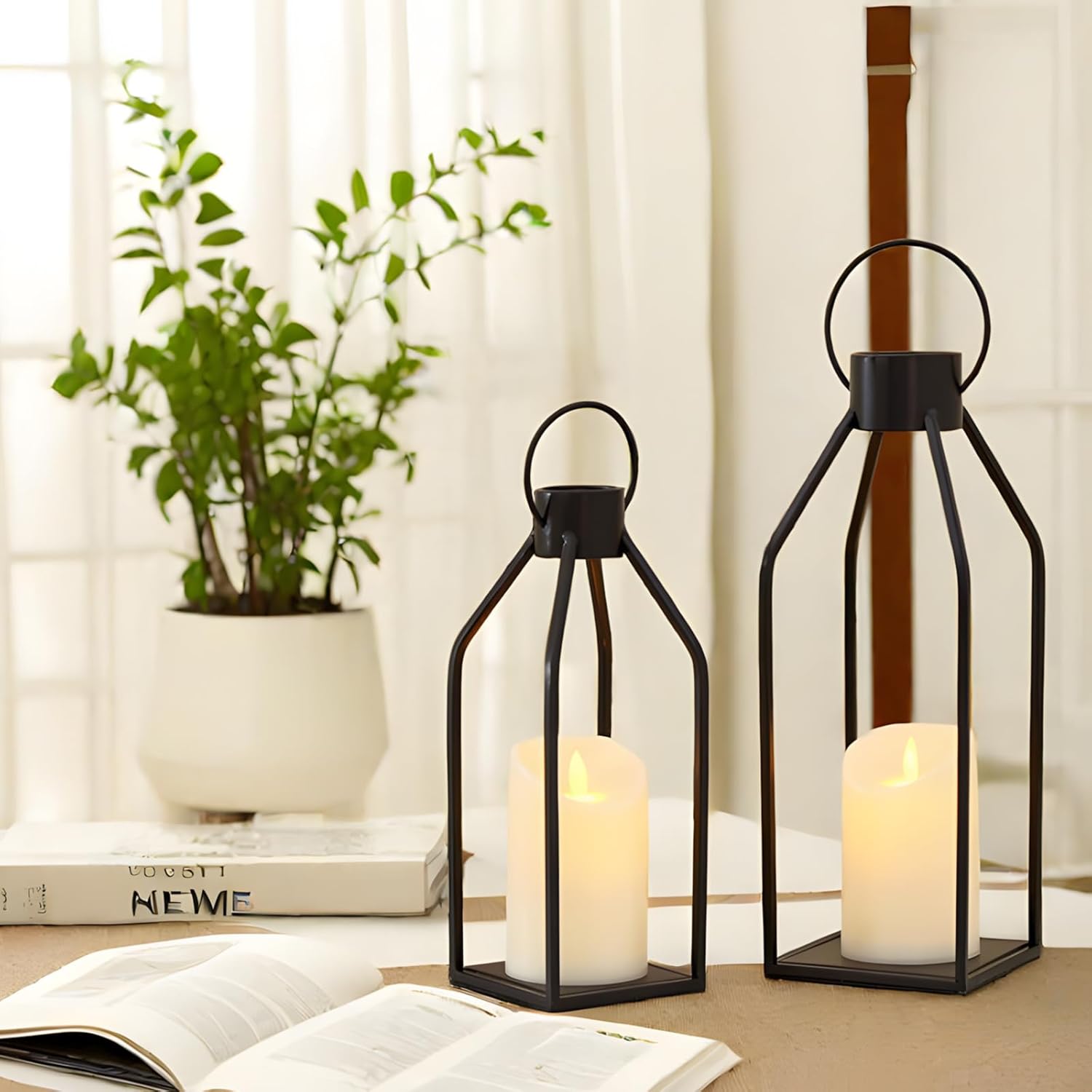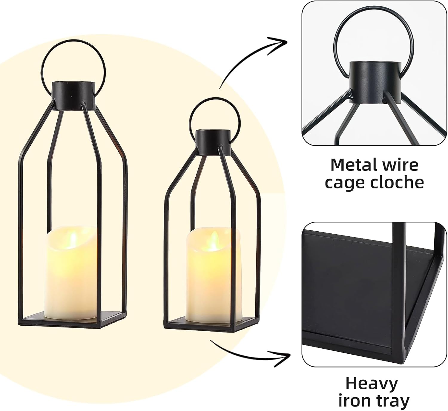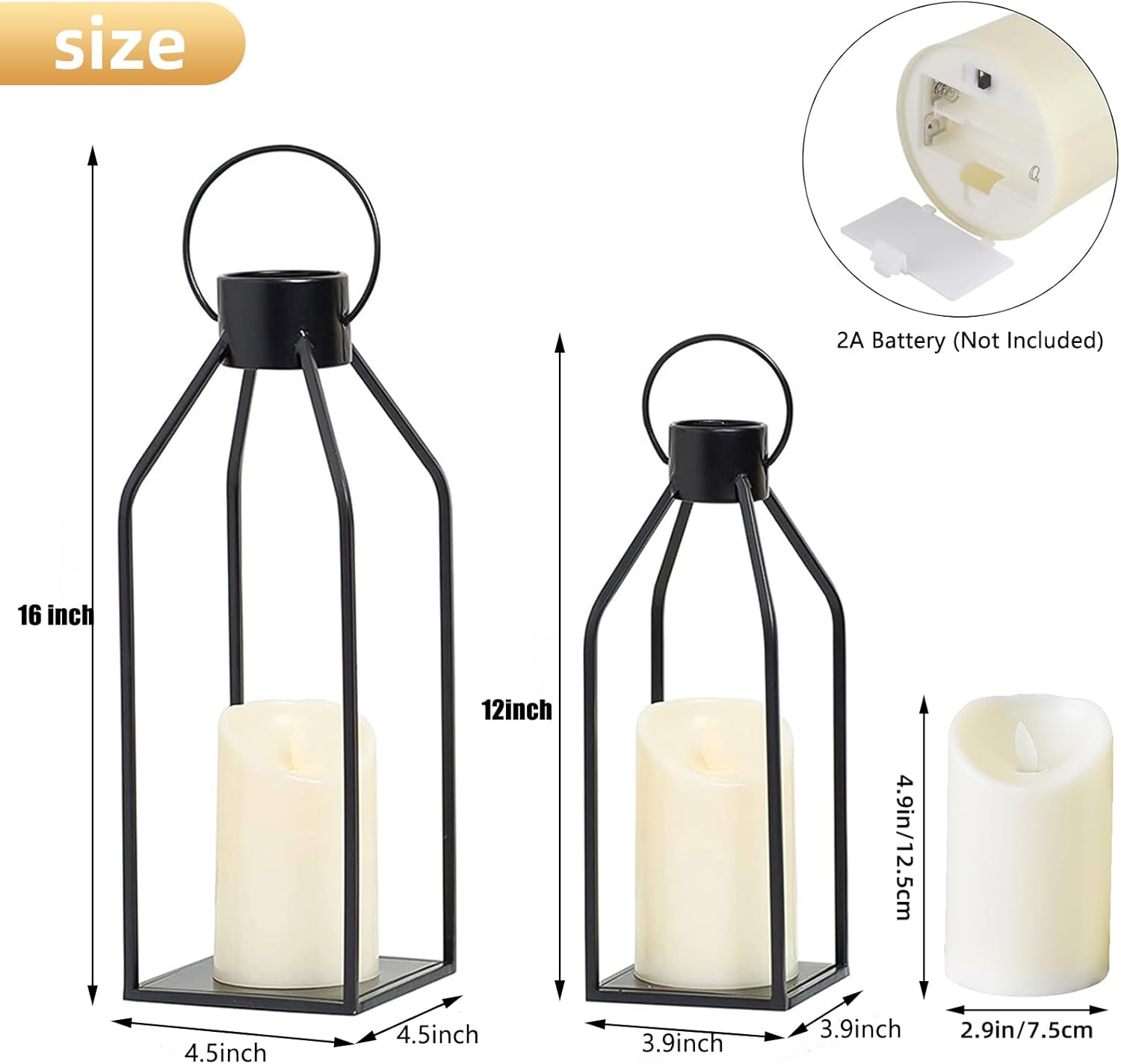 Modern Farmhouse Lantern Decor,16” 12” 2 Pcs Metal Candle Lanterns with Flameless Candles Black Decorative Lantern for Front Porch Covered Patio Dining Table Entryway Table Wedding Home Decor